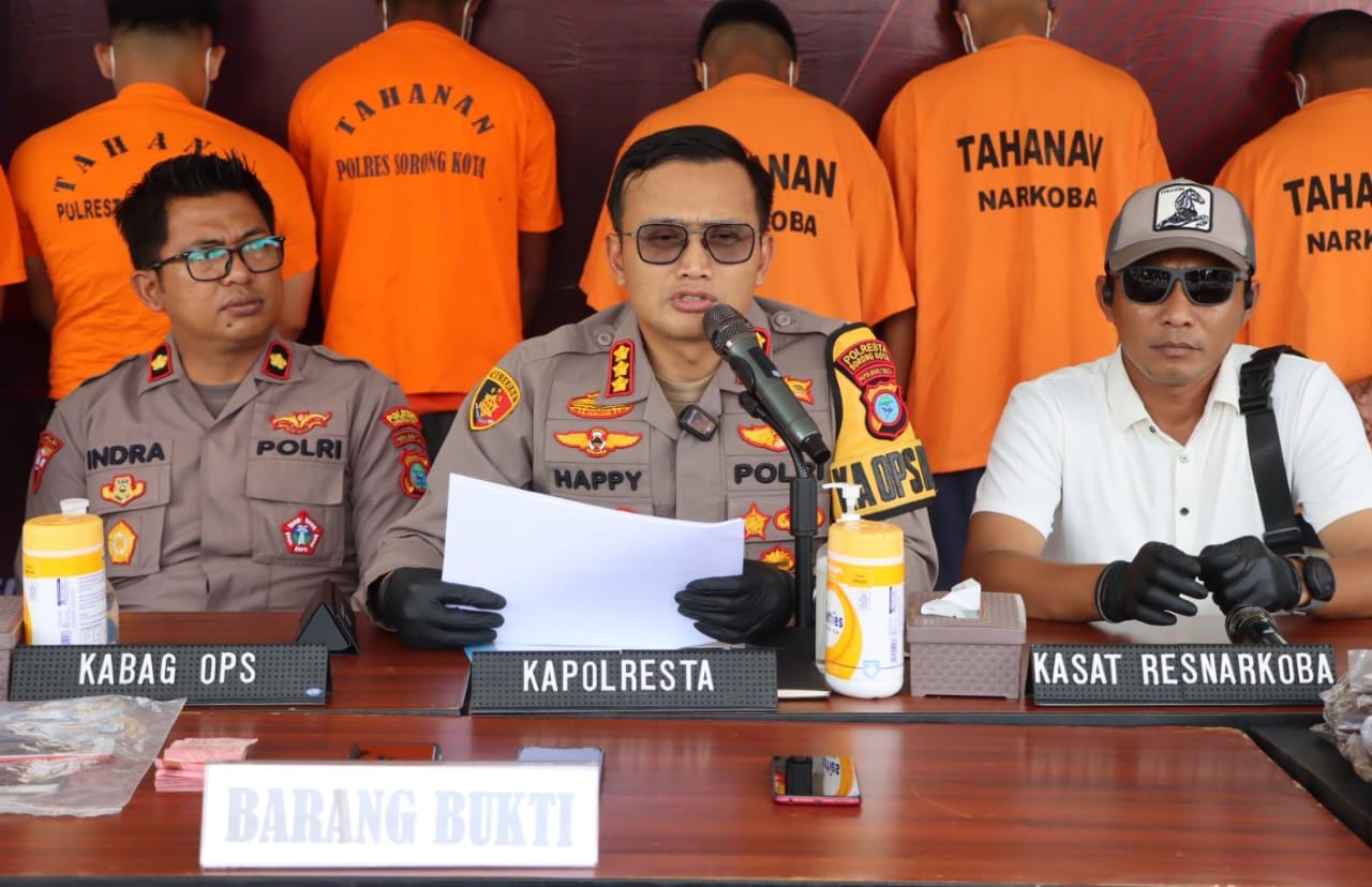 KOTA SORONG PBD, BUSERJATIM.COM GROUP (04/02/25) – Polresta Sorong Kota menggelar konferensi pers untuk mengungkap beberapa kasus kriminal yang terjadi di Kota Sorong. Kapolresta Sorong Kota, Kombes Pol. Happy Perdana Yudianto, S.I.K., M.H., menyampaikan bahwa pihaknya berhasil mengungkap dua kasus curanmor, dua kasus narkoba jenis ganja, serta satu kasus penipuan yang melibatkan pelaku yang menggunakan aplikasi media sosial untuk menipu korban. Dalam penanganan kasus curanmor, pelaku yang berinisial JN telah diamankan, sementara dua tersangka lainnya masih buron. Sedangkan dalam kasus narkoba, dua pelaku yang masing-masing berinisial MS dan A terlibat dalam peredaran ganja dengan total barang bukti lebih dari lima kilogram. Kapolresta mengingatkan masyarakat untuk meningkatkan kewaspadaan serta bekerja sama dengan polisi dalam upaya menjaga keamanan.