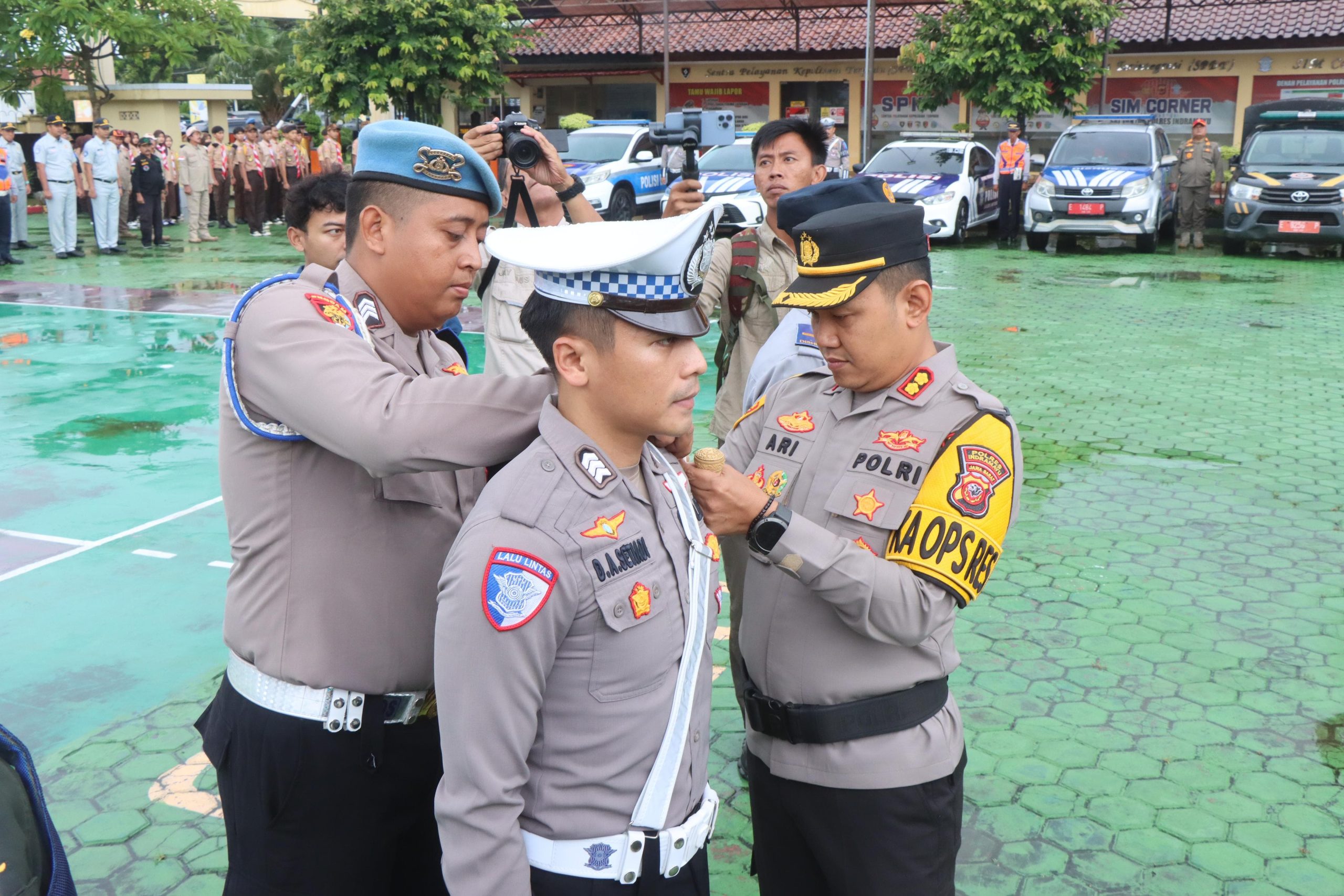 Sebagai tanda dimulainya operasi, Kapolres Indramayu, AKBP Ari Setyawan Wibowo, S.H., S.I.K., M.Si., memasangkan pita operasi kepada perwakilan personel.