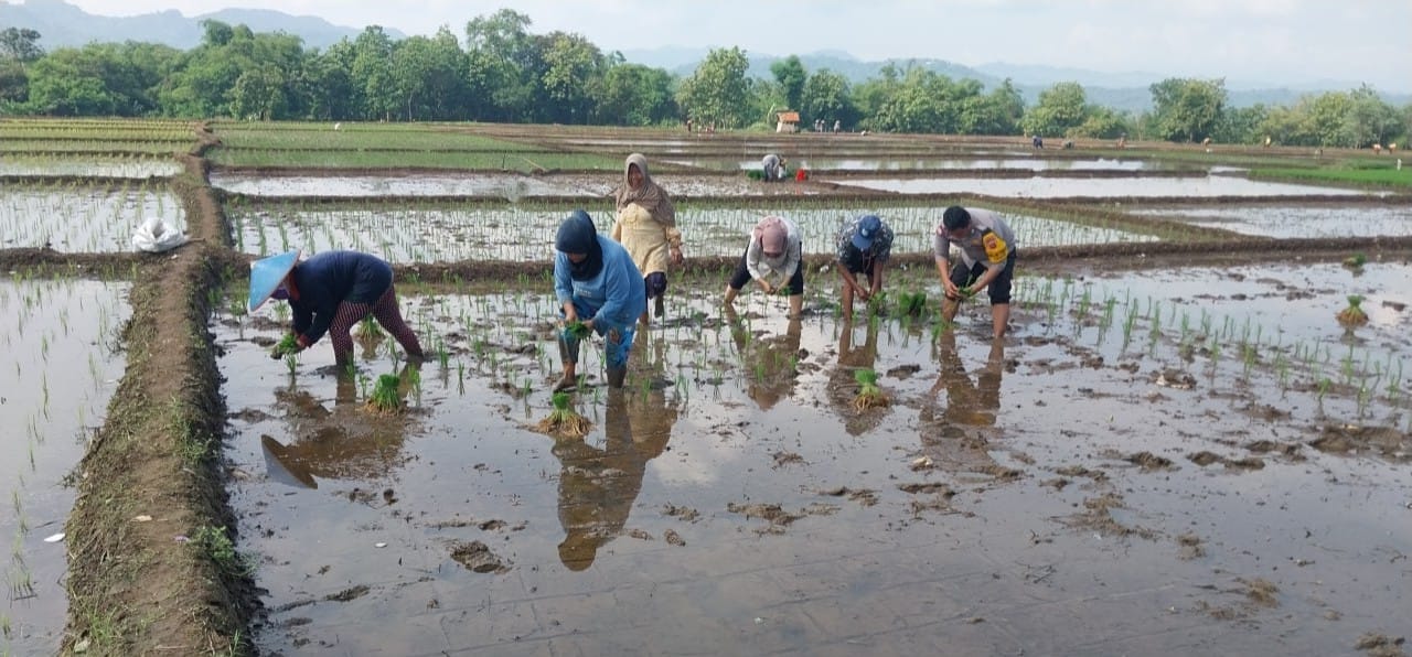 Bhabinkamtibmas Polsek Majalengka Kota Brigadir Nuryanto Bantu Ibu-Ibu Petani Tanam Benih Padi Sebagai Dukungan Polri untuk Swasembada Pangan