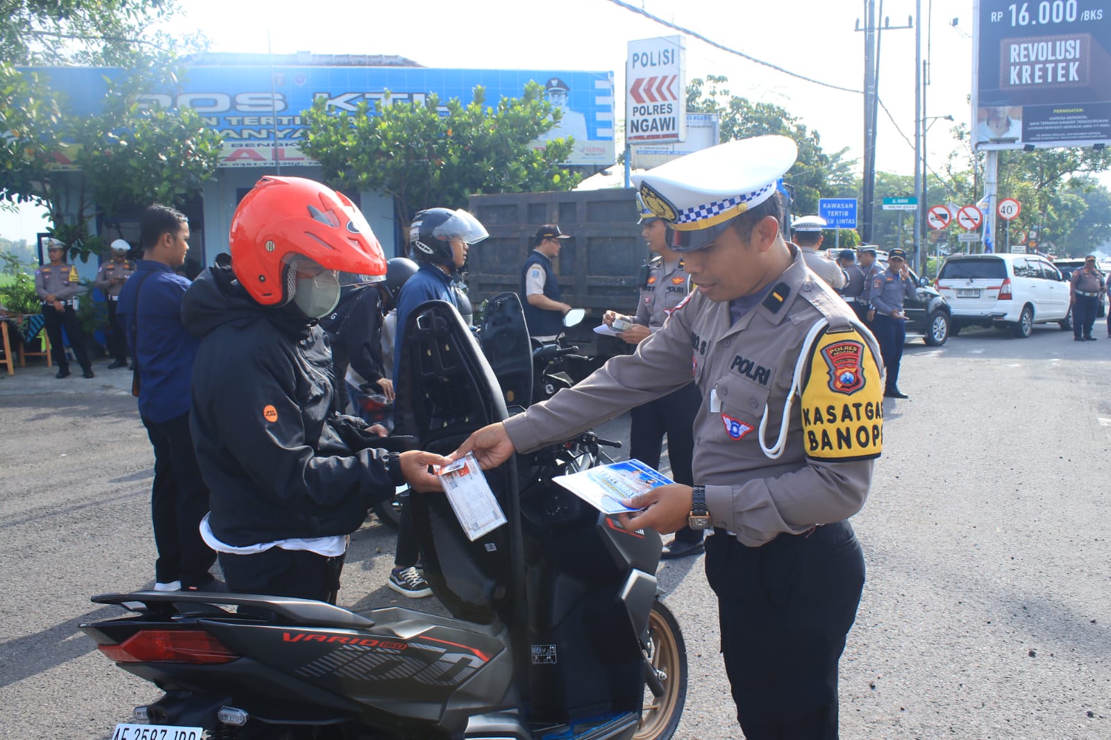 Ngawi,Buserjatim.com group – Satuan Lalu Lintas (Satlantas) Polres Ngawi Polda Jatim bersama Jasa Raharja dan Dinas Pendapatan Daerah (Dispenda) Ngawi menggelar razia dalam rangkaian Operasi Keselamatan Semeru 2025 di Pos Banyakan, Ngawi.