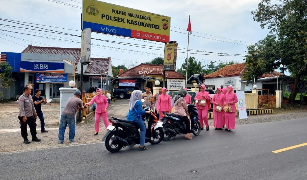 Majalengka, Dalam rangka menyambut bulan suci Ramadan 1446 H, Polsek Kasokandel bersama Bhayangkari menggelar kegiatan sosial berupa pembagian takjil kepada masyarakat dan pengguna jalan di depan Mako Polsek Kasokandel, Jalan Raya Bandung – Cirebon, Desa Kasokandel, Kecamatan Kasokandel, Kabupaten Majalengka, Minggu (16/3/2025).