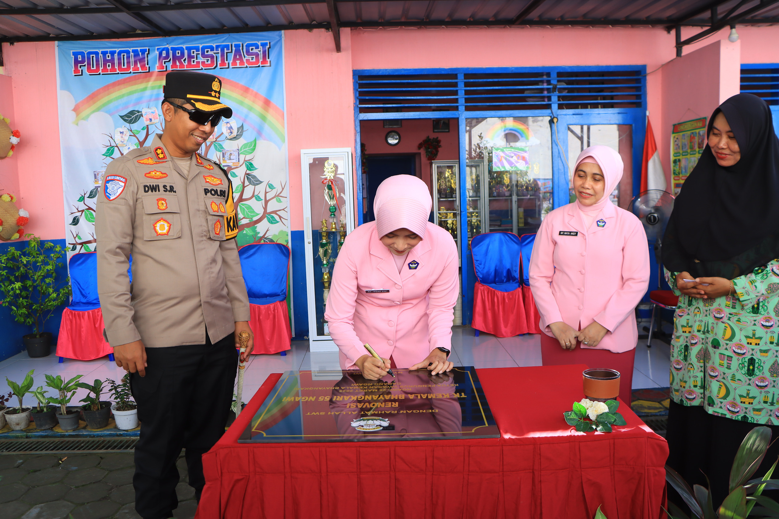 Setelah menandatangi prasasti, Ny. Indah Dwi bersama Kapolres Ngawi didampingi Kabag Log AKP Suyadi, S.H., dan pejabat utama Polres Ngawi serta Pengurus Yayasan Kemala Bhayangkari Cabang Ngawi juga Kepala Sekolah dan para guru, meninjau bangunan TK Kemala Bhyangkari 55 yang akan direnovasi.