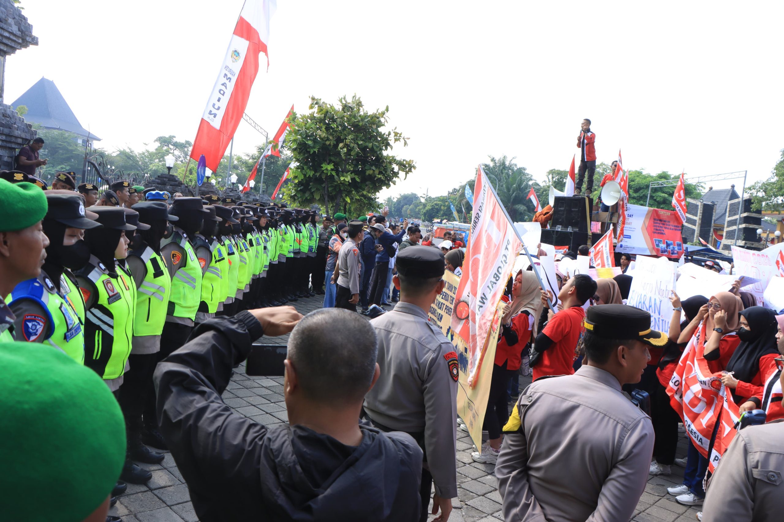 Madiun – Personil Polres Madiun dipimpin langsung oleh Kapolres Madiun AKBP Mohammad Zainur Rofik laksanakan pengamanan kegiatan penyampaian aspirasi damai dalam rangka memperingati Hari Buruh Internasional (May Day) yang digelar di depan Pendopo Ronggo Djoemeno, Caruban, Kabupaten Madiun, Kamis (1/5/2025).