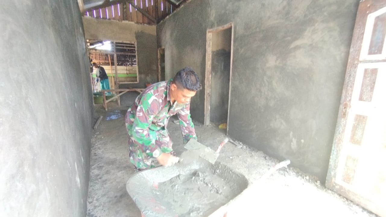 Pengerjaan Rumah yang telah mencapai tahap plester dan pengacian dikerjakan dengan cermat oleh Satgas TMMD Ke-124 Kodim 1802/Sorong dengan di bantu oleh warga dan tuan rumah.