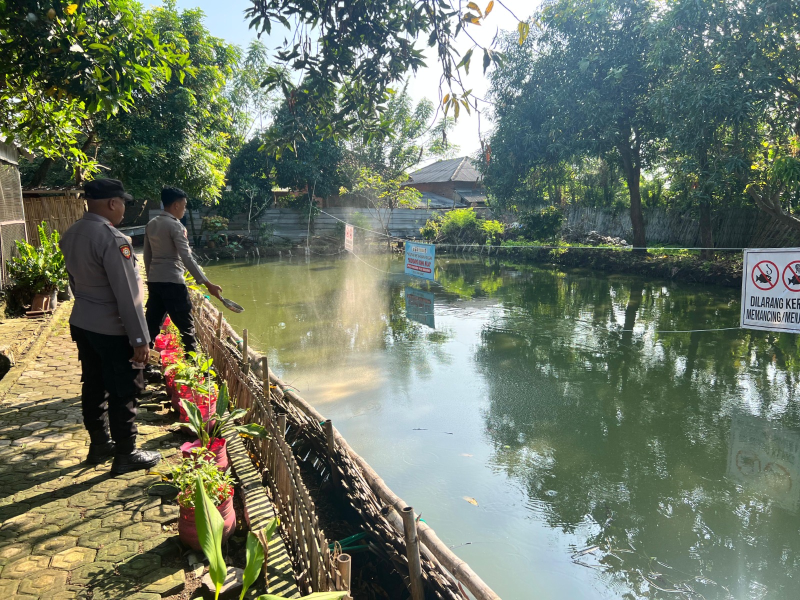 Indramayu – Dua personel Bhabinkamtibmas Polsek Krangkeng, Polres Indramayu, Polda Jabar yakni Aipda Demi Sentosa dan Bripda Aspar melaksanakan kegiatan pemberian pakan ikan nila di kolam budidaya yang merupakan bagian dari program Lahan Pekarangan Bergizi milik Polsek Krangkeng, Rabu (28/5/2025).