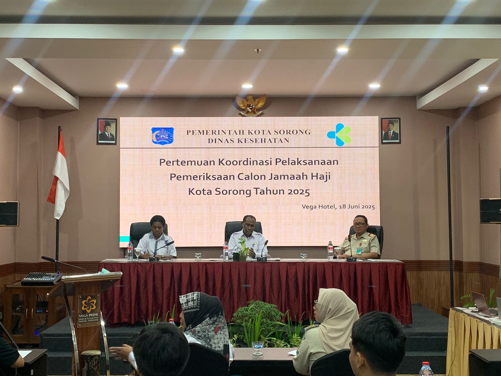 KOTA SORONG PBD, BUSERJATIM.COM GROUP – Dalam rangka menjaga kesehatan calon jamaah haji, Dinas Kesehatan Kota Sorong mengadakan pertemuan koordinasi pemeriksaan calon haji di sebuah hotel di Kota Sorong, Rabu (18/6/25). Pertemuan ini menjadi upaya strategis untuk menekan risiko penyakit yang kerap ditemukan pada calon jamaah haji.