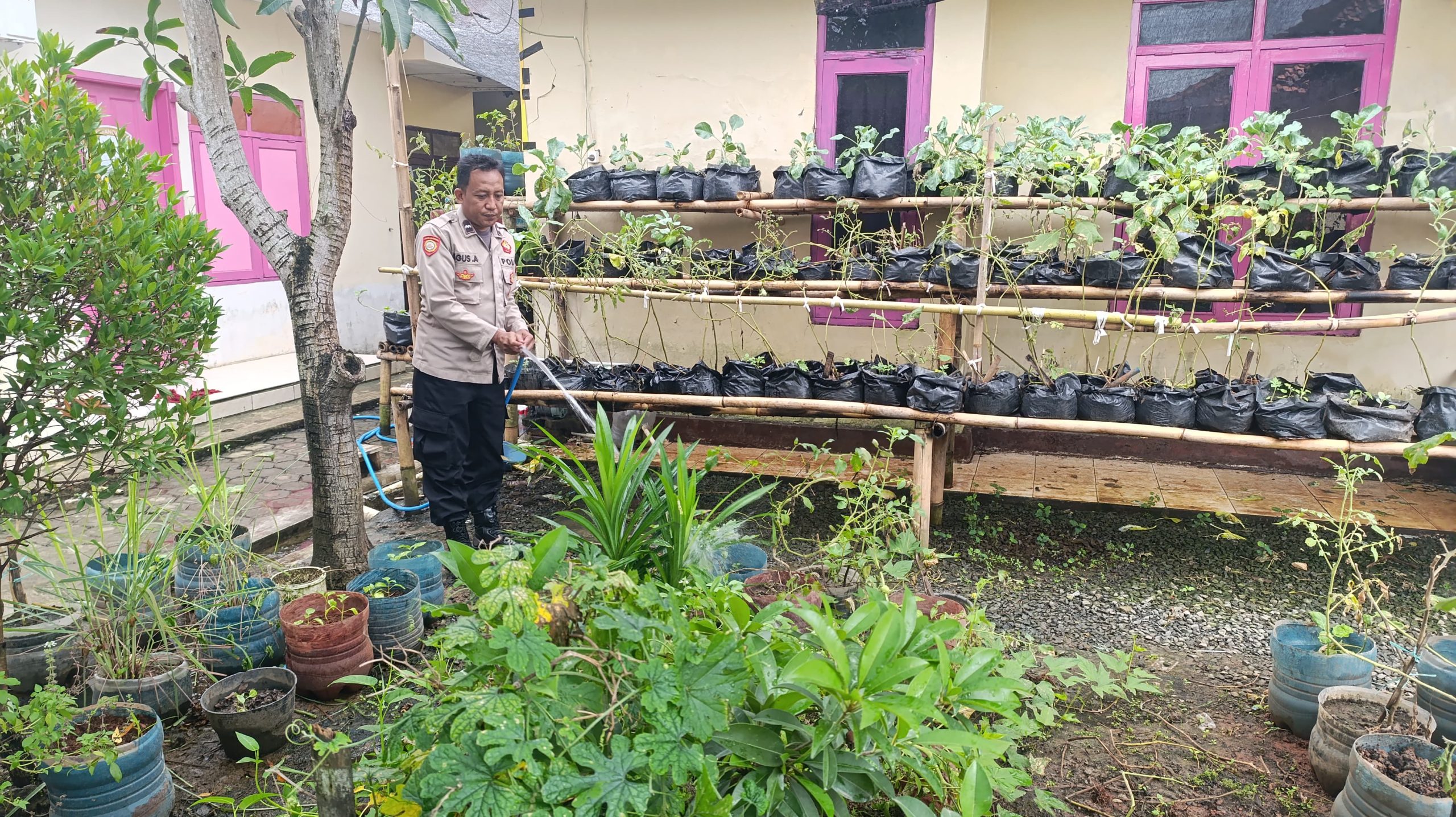 Indramayu – Di sela tugas kepolisian yang padat, Aipda Agus A terlihat menyiram tanaman dan memantau kondisi kolam ikan di halaman belakang Polsek Karangampel, Minggu (6/7/2025).