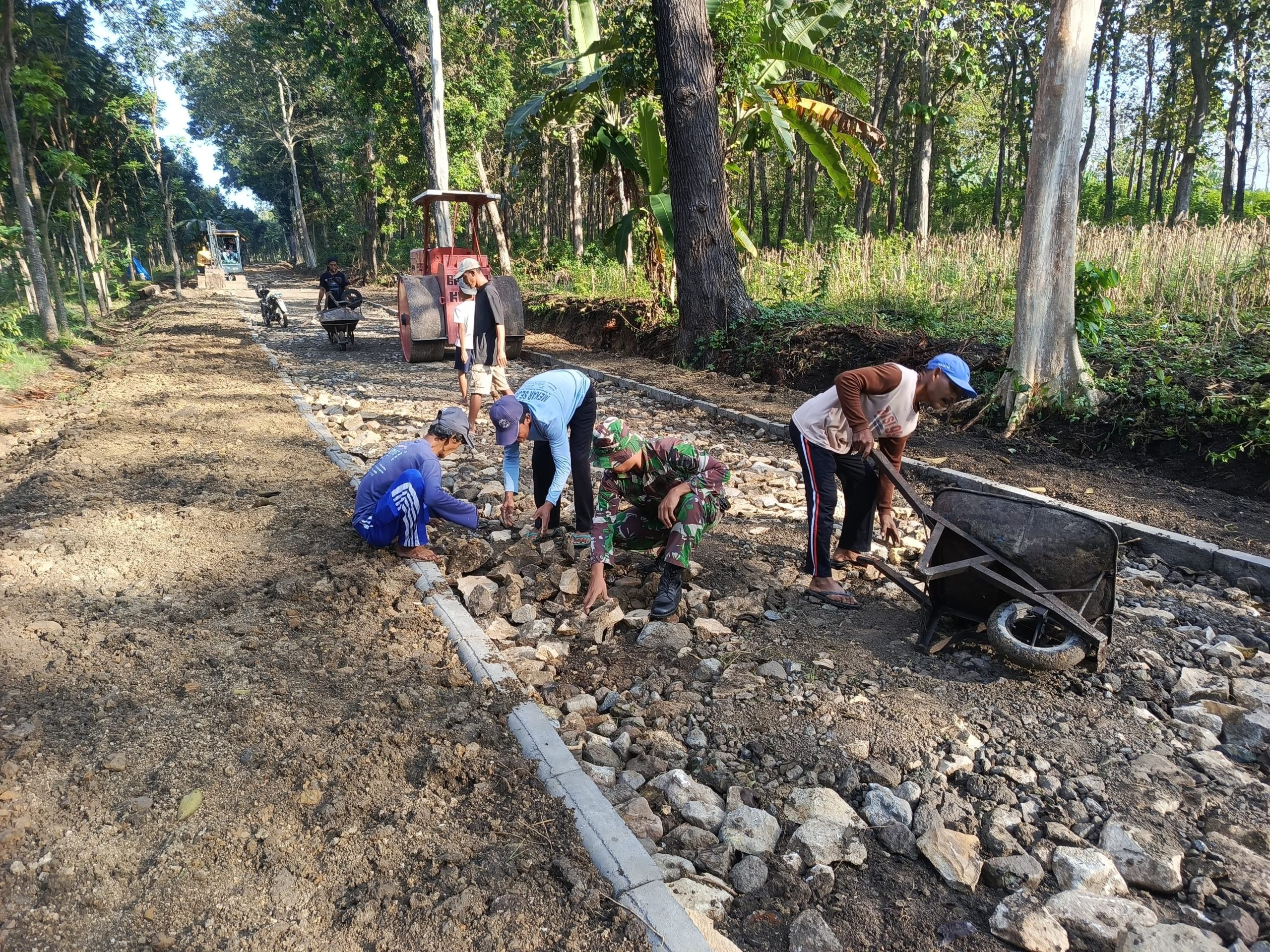 Saat di lokasi, terlihat jelas kekompakan gotong-royong saling membantu antara Babinsa dengan warga setempat dalam pemasangan batu makadam untuk pengerasan permukaan jalan desa sehingga ketika musim penghujan tidak terjadi becek dan masyarakat dapat beraktivitas dengan nyaman.