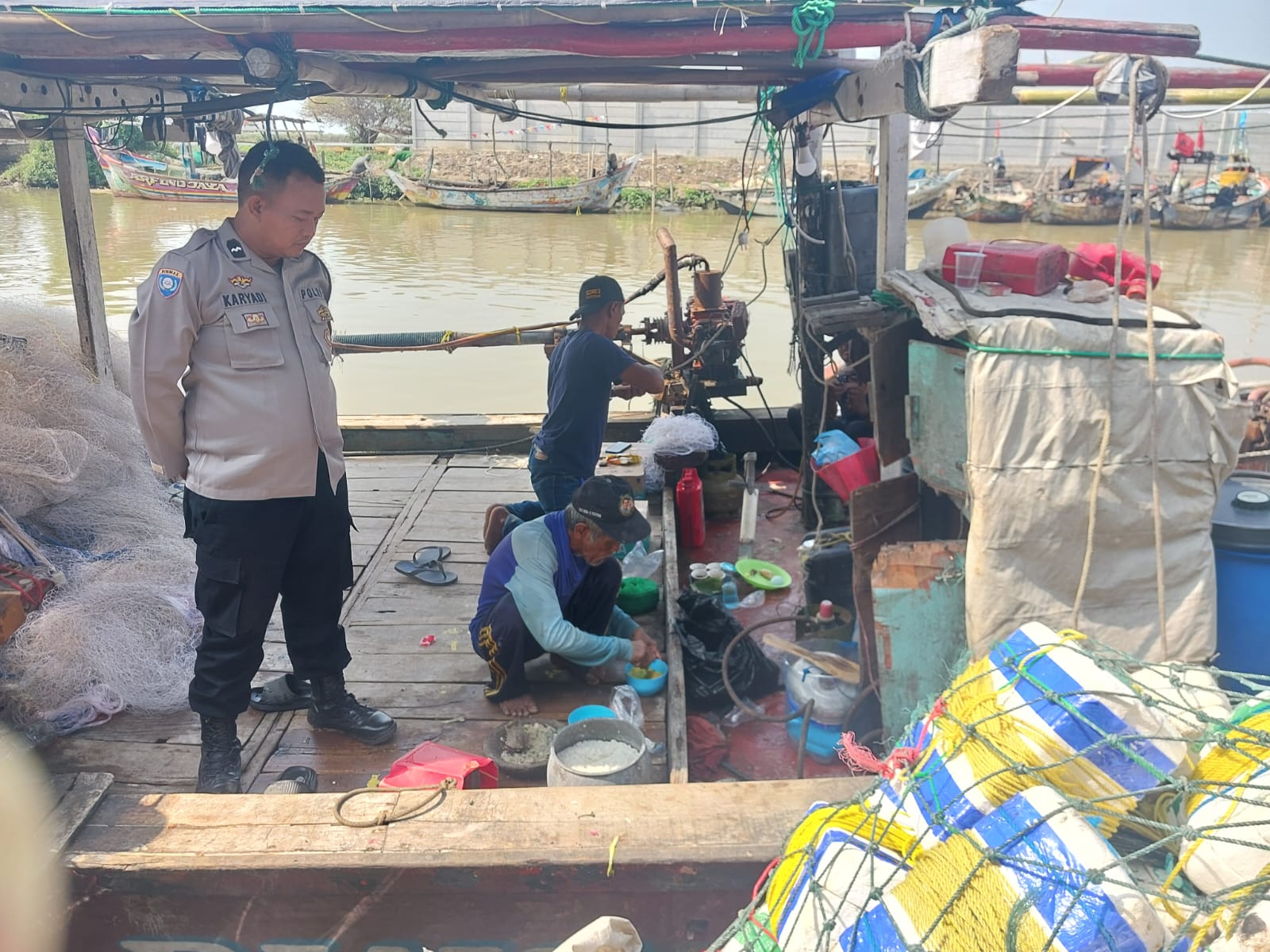 Tak sekadar menyapa, AIPDA Karyadi juga melakukan pengecekan terhadap kondisi keamanan kapal serta menyampaikan imbauan tentang pentingnya keselamatan saat melaut.