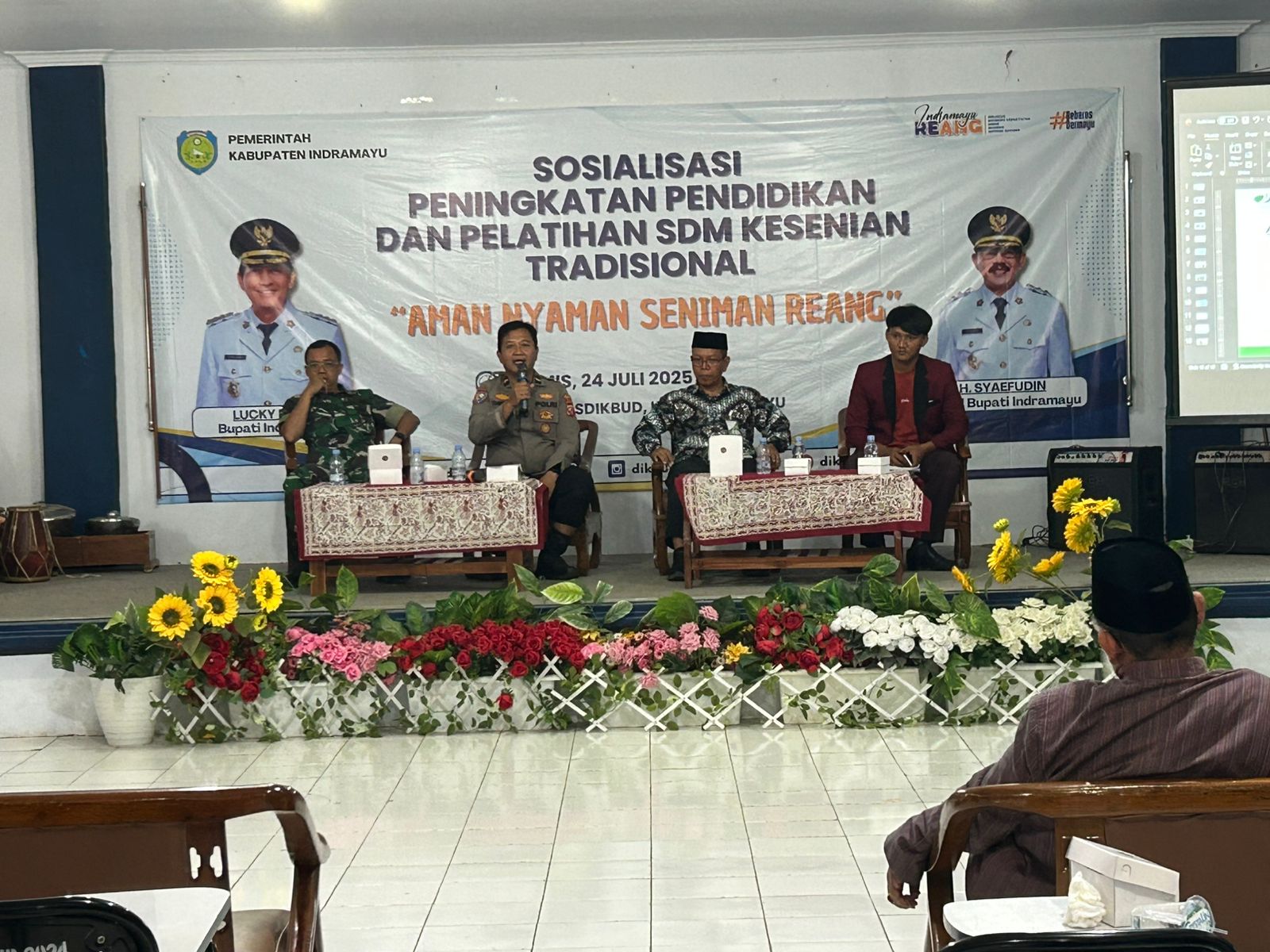 Kapolres Indramayu AKBP Mochamad Fajar Gemilang, S.I.K., M.H., M.I.K., diwakili oleh KBO Sat Binmas IPDA Tasim, S.I.P., hadir sebagai narasumber dalam kegiatan yang diikuti oleh sekitar 200 seniman tradisional dari berbagai kecamatan.