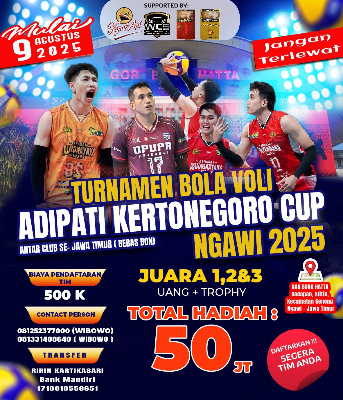 Turnamen bola voli Adipati Kertonegoro Cup 2025, yang rencananya akan digelar pada 9 Agustus 2025, di GOR Bung Hatta diisi oleh para pemain profesional bukan hanya klub-klub dari Ngawi saja, namun juga dari berbagai daerah di Jawa Timur.