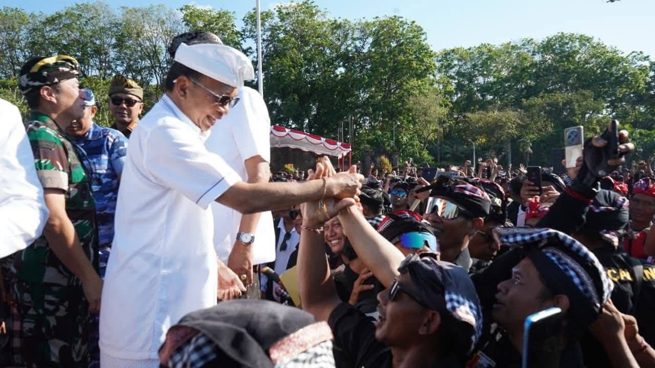 Denpasar – Hadiri Gelar Agung Pecalang, Gubernur Wayan Koster serukan ; Pecalang Bali…Bali Aman, Bali Aman, Bali Aman, Merdekaaa…!!!gemuruh semeton Pecalang Bali yang memadati Lapangan Niti Mandala Renon, Bali, Denpasar, Senin, 1 September 2025.